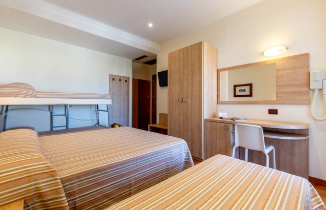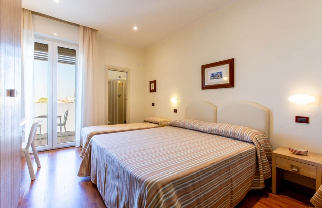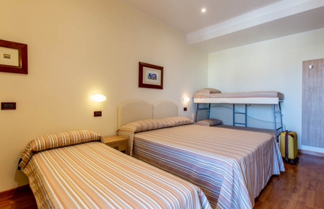 Le nostre camere quintuple sono allestite in modo funzionale, con televisore-led 32", mini frigo, balconcino coperto ed arredato, nuovi servizi con box doccia e sanitari sospesi, WI-FI illimitato, aria condizionata programmabile dall’ospite, cassaforte digitale, asciugacapelli, porta di sicurezza con controllo accessi, nuovi materassi ortopedici e guanciali in memory-foam.
